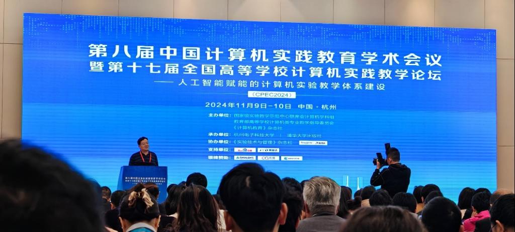 本次CPEC2024高峰论坛由教育部高等学校计算机类专业教学指导委员会、国家级实验教学示范中心联席会计算机学科组等多家单位联合主办,杭州电子科技大学与清华大学出版社承办。会议聚焦“人工智能赋能的计算机实验教学体系建设”,吸引了来自全国各地的近300位高校教师、实践实验教学中心的负责人及企业代表参会交流。