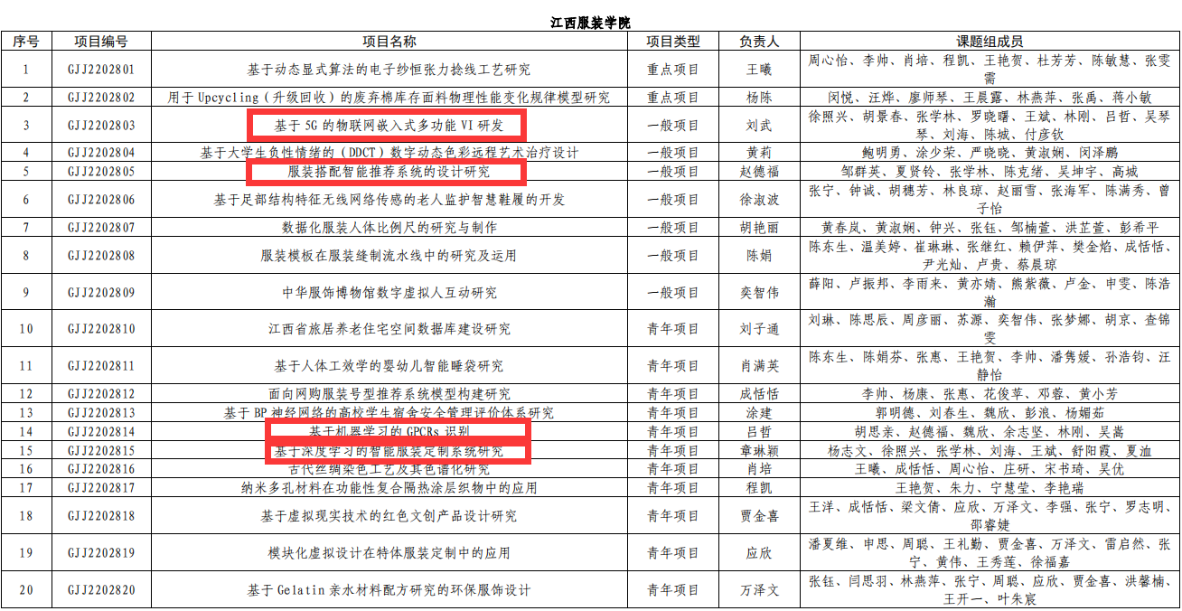 【pp电子游戏平台官网讯】近日,江西省教育厅发布《关于公布2022年度江西省教育厅科学技术研究项目立项名单的通知》(赣教研字﹝2023﹞2号)文件,pp电子赵德福副院长主持申报的《服装搭配智能推荐系统的设计研究》、刘武教师主持申报的《基于5G的物联网嵌入式多功能VI研发》、吕哲教师主持申报的《基于机器学习的GPCRs识别》、章琳颖教师主持申报的《基于深度学习的智能服装定制系统研究》等4项获批立项,立项数创历史新高。