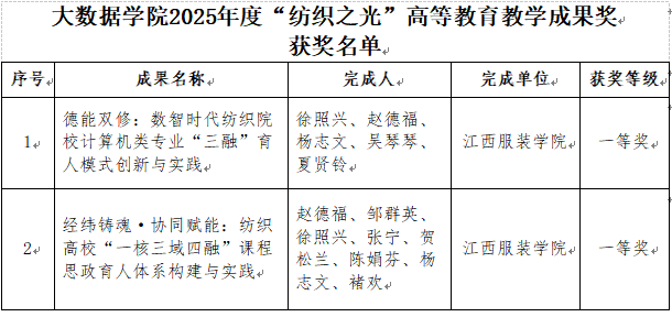 【pp电子游戏平台官网讯】近日,中国纺织服装教育学会正式发布《关于公布2025年度“纺织之光”纺织高等教育教学成果竞赛结果的通知》(中纺教〔2025〕53号)。pp电子徐照兴教授主持的《德能双修:数智时代纺织院校计算机类专业“三融”育人模式创新与实践》、赵德福教授主持的《经纬铸魂・协同赋能:纺织高校“一核三域四融”课程思政育人体系构建与实践》两项成果,在全国众多参赛成果中脱颖而出,双双荣获2025年“纺织之光”高等教育教学成果奖一等奖。