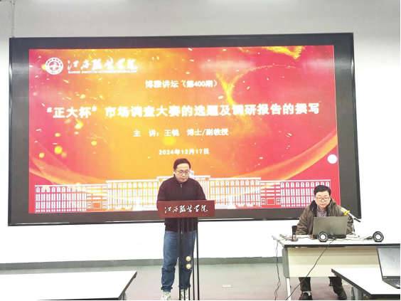 【pp电子游戏平台官网讯】2024年12月17日下午2:00在图书馆学术报告厅成功举办了第400期博雅讲坛,报告主题为“‘正大杯’市场调查大赛选题及调查报告撰写”。本次报告旨在提高我校师生对市调大赛的重视,为第十五届“正大杯”市调大赛的参赛做铺垫。本次报告邀请到江西理工大学副教授、硕士生导师、“正大杯”国赛一等奖指导老师王锐博士主讲,报告由pp电子游戏平台官网副院长刘巍博士主持。他代表学院对王博士的到来表示热烈的欢迎,简要介绍了本次学术报告的目的和意义。