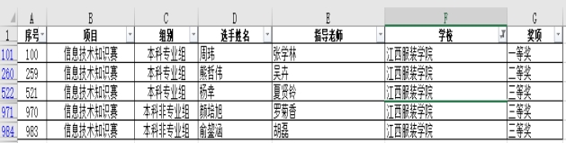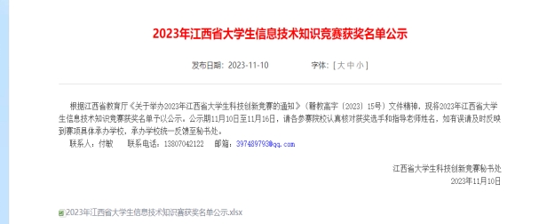 近日,2023年江西省大学生信息技术知识大赛成绩在江西省教育厅官网公示,我校学子荣获江西省本科专业组一等奖1项、二等奖1项、三等奖1项,本科非专业组三等奖2项,共计5个奖项。