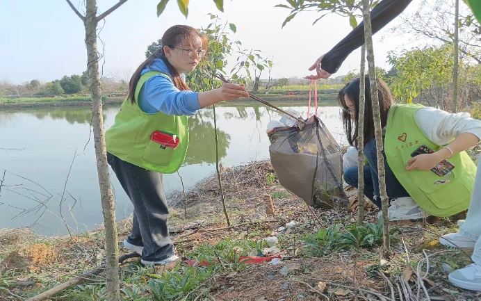 身穿绿色马甲的身影是春日暖阳下一道亮丽的风景,他们携带垃圾袋,火钳等工具,来到江西服装学旁的一处河流开展河岸垃圾清理工作。“河小青”志愿者们分组行动,沿着河岸分类回收各类垃圾,确保每一件垃圾都收入囊中。