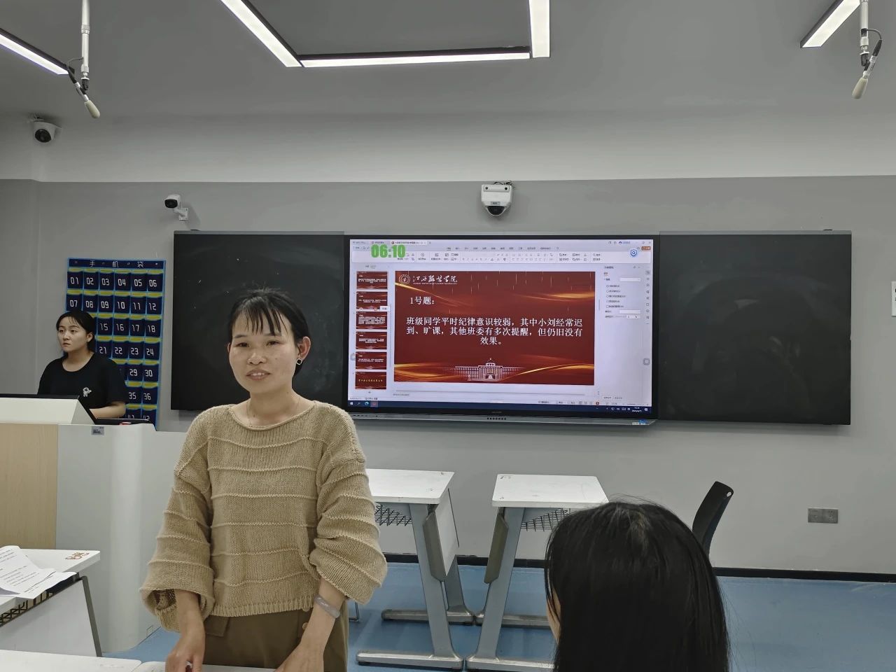 【pp电子游戏平台官网讯】班长是班级管理中的核心力量,在班集体建设中发挥着组织管理、服务同学和引领示范带头作用,是班主任工作顺利进行的得力助手。为进一步发挥班长典型引领示范作用,切实加强班集体建设,提高班级学生素养。pp电子游戏平台官网于2024年4月25日星期四在主教楼339开展了好班长争霸赛淘汰赛,本次比赛特邀学工办副主任周文琴、倪若荑等辅导员担任本次评委。
