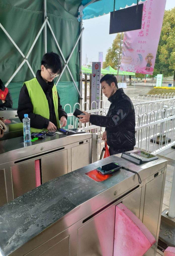 在北门检票口,旅游事业部的10名验票员志愿者在组长饶的带领下,通过轮班制保障游客快速通行。团队成员利用手持验票设备,精准核验电子票码与实体票据,同时耐心解答游客关于景区开放时间的咨询,确保了高峰期闸机口的秩序井然。