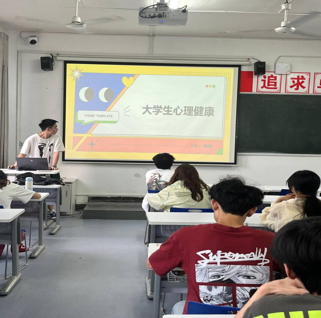 会议上,上一年度心理大使易振楠作为主讲人,为在场同学带来了一场生动而深刻的心理健康知识普及活动。易振楠同学首先强调了心理健康对大学生发展的关键作用。他结合PPT中“情感与情绪的平衡”“社会适应能力”“认知功能正常运作”等要点,指出心理健康不仅是学业成功的基石,更是人际交往与自我成长的关键。他以“情绪管理对学业的影响”“自我认知与目标设定”等案例,深入浅出地解析了心理健康与大学生日常生活的紧密联系,引发了在场学生的共鸣。