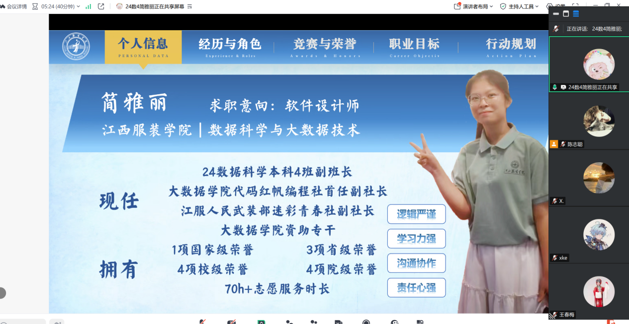 经过激烈的评比,最终四位同学脱颖而出。来自23数据科学本科4班的李懿,以“数据女孩逐梦球场”为切入点,结合课程与技能、一线执教经历、校园履历等,展现了在篮球教练领域结合数据科学背景的发展规划与核心竞争力,最终荣获一等奖。23数据科学本科3班的杨小玉,围绕“三支一扶”志愿者的目标,介绍了自身专业技能、服务精神及相关经历,获得二等奖。24数据科学本科4班的简雅丽和23数据科学本科1班的李怡红也表现出色,分别从不同职业方向,阐述了职业目标、发展路径、计划及评估调整等内容,获得三等奖。