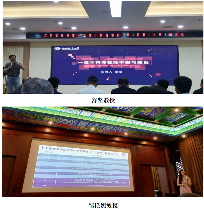 会议期间,南昌航空大学软件学院舒坚教授就国家一流课程的申报和建设从一流课程的建设内容和推荐条件、一流课程的申报、一流课程的建设三个方面进行了详细的讲解。南昌大学信息工程学院邹艳妮教授以“工程教育认证自评报告撰写及进校考察工作交流”做了主题报告。